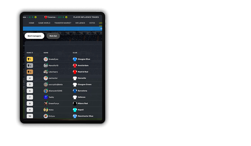 Collaborate with other influencers make strategic decisions, and secure the club's long-term success.